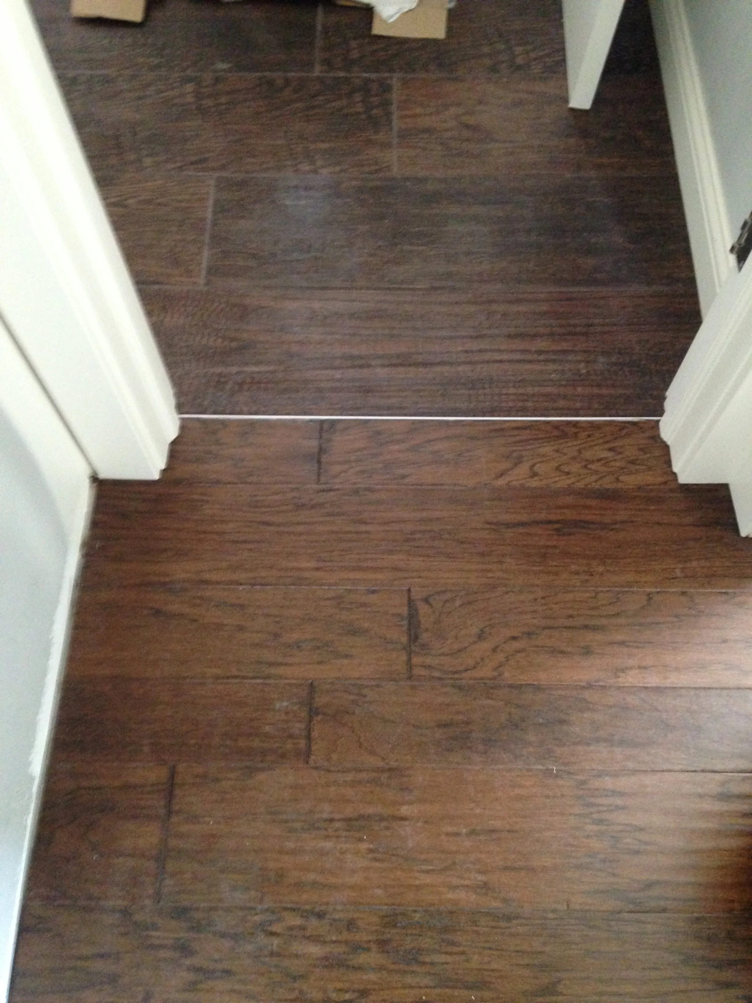 Porcelain tile meets with Hickory hardwood. It’s hard to tell the difference between the two materials.